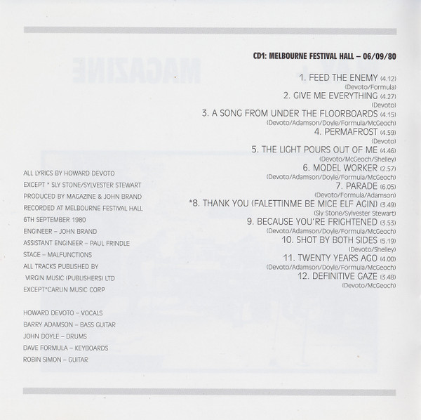Producer – John Brand (tracks: 1-1 to 1-10), Magazine (tracks: 1-1 to 1-10)